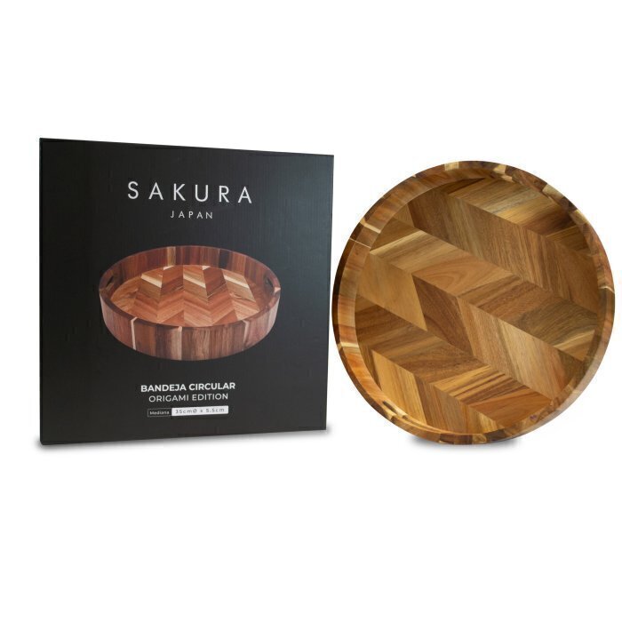Elegante bandeja circular de la colección Origami Edition de Sakura, confeccionada en madera de acacia natural. Con un diámetro de 35 cm y altura de 5,5 cm, es ideal para servir con estilo, presentar aperitivos, desayunos o decorar tu mesa con un toque cálido y moderno.